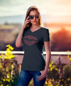 Red Sexy Lips T Shirt Kiss Lipstick Shiny Rhinestone Sparkly Women